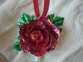 I used the latest punches by McGill, called Paper Blossoms to make this necklace. A peony was shaped with the required punches. After some experimenting, I found that a thin metal could be used to punch the flower shapes. Also I try to fashion something with more then one purpose. Beside the use of this flower as a necklace, it can be removed from the ribbon than used as a lapel pin or pinned onto another item as an embellishment because a pin back was also applied.